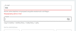 Nie trać czasu użytkownika – kiedy to możliwe, wyświetl komunikat o błędzie jeszcze zanim użytkownik naciśnie przycisk “wyślij”. Dzięki temu skrócisz cały proces i sprawisz, że stanie się on łatwiejszy. Takie rozwiązanie wdrożyło np. Allegro, które na bieżąco sprawdza poprawność wpisywanych danych (dokładnie w momencie przejścia do kolejnego pola).