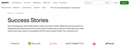 Upwork ma nietypowe wyzwanie: obsługuje jednocześnie firmy i freelancerów. Rozwiązaniem jest podział case studies na dwie ścieżki, z osobnymi historiami sukcesu dla każdej grupy odbiorców. Upwork stawia wyłącznie na format wideo, co pozwala szybko budować autentyczność i zaufanie – widz słyszy i widzi prawdziwą osobę opowiadającą swoją historię. To skuteczna strategia, bo zastąpienie tekstowych rekomendacji wideo-testimonialami potrafi podnieść konwersję o 80%[27].