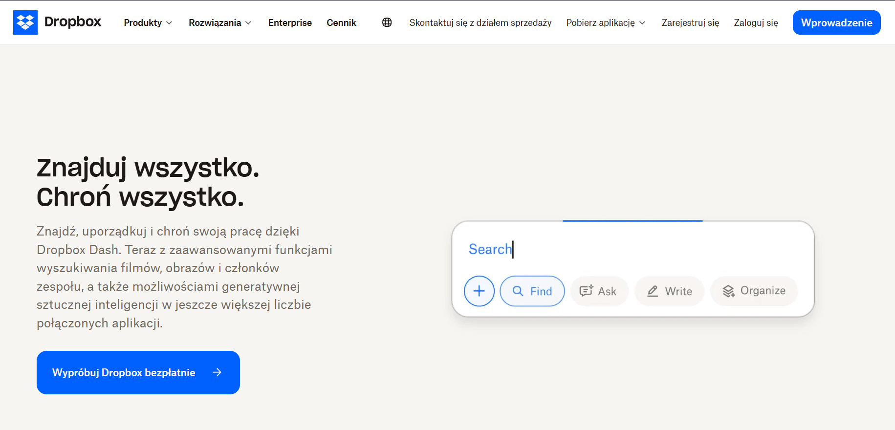 Dropbox to jedna z najczęściej przywoływanych stron, jeśli chodzi o skuteczność prostoty. Biała przestrzeń, zwięzły nagłówek, jedno wyraźne CTA i nic więcej. Tego typu podejście sprawdza się, bo użytkownicy czytają zaledwie ok. 20% tekstu na stronie[17]. Skoro tak, lepiej powiedzieć mniej, ale celniej. Sekcja „Protect & Control” na podstronie biznesowej Dropboxa buduje zaufanie przez komunikaty o bezpieczeństwie danych i certyfikacjach, a to szczególnie ważne w SaaS, gdzie klient powierza firmie swoje pliki.